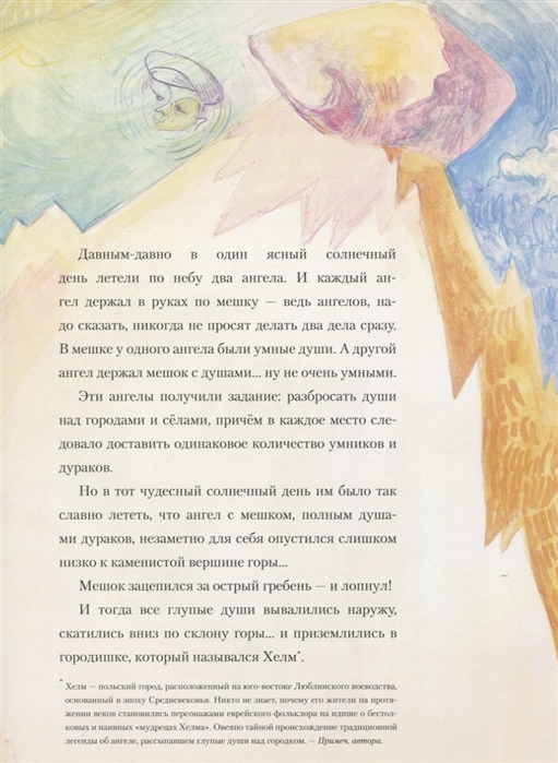 Сможешь ли ты перевернуть шляпу вверх дном, чтобы она оставалась сухой во время дождя? Станешь ли ходить босиком по снегу, чтобы не промокли ботинки? Скажешь, очень похоже на небылицу? А вот обитатели городка Хелм проделывают такое — и не только! — не во сне, а наяву. И вообще, они очень странные люди — с ними всегда происходит что-то волшебное. Во всяком случае, так им кажется...